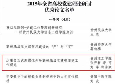 近日,中共贵州省委教育工作委员会印发《关于表彰2015年全省高校党建理论研讨优秀论文暨基层党建主题实践活动优秀成果的决定》(黔教(委)组发〔2015〕69号),我院张开智院长主持,李可、刘萍、钟诗颖老师参与撰写的《运用交互式新媒体发展高效基层党建带团建工作研究》一文荣获一等奖。