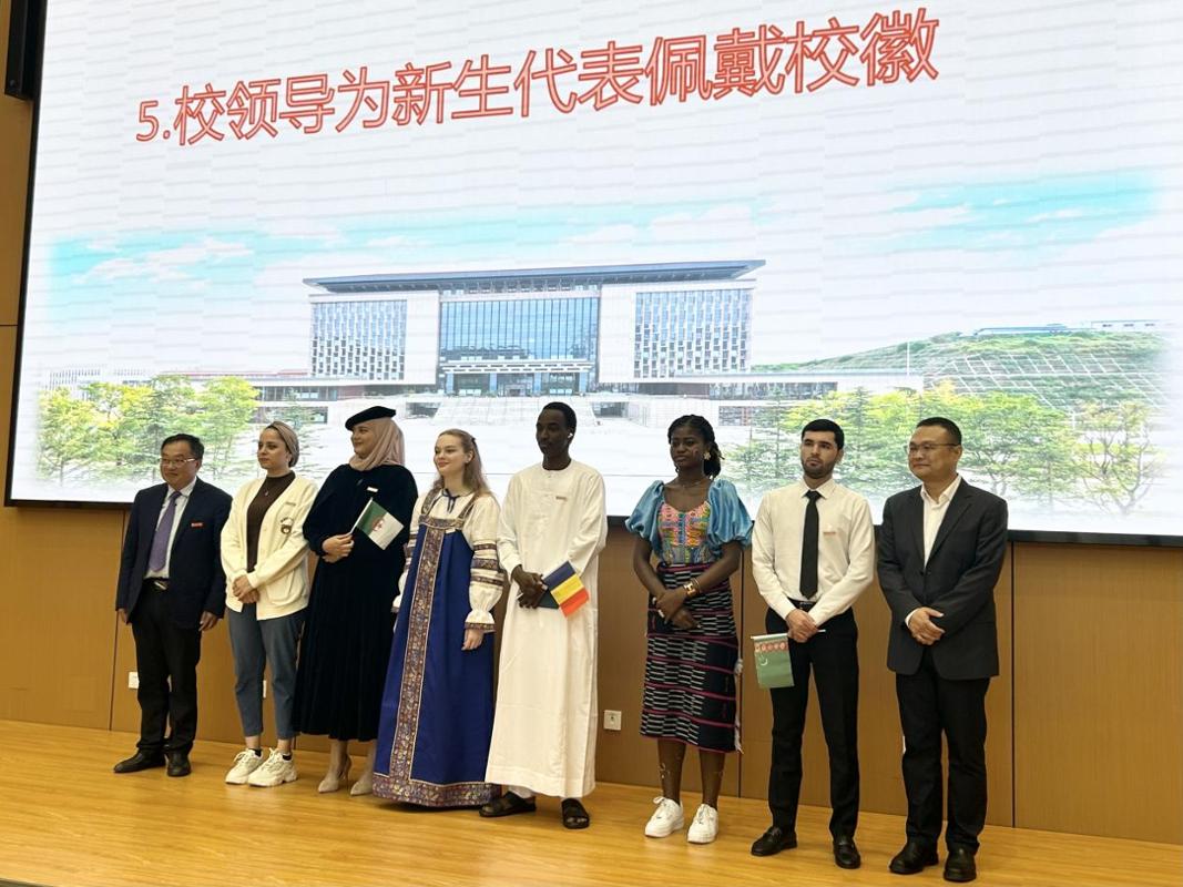 校领导为2024级国际学生代表佩戴了校徽,典礼在校歌“莫负好时光”中落下帷幕。