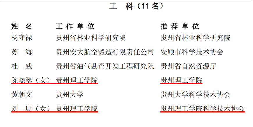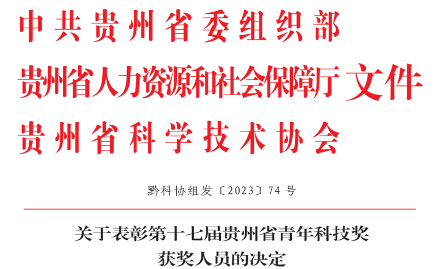 本网讯(科技处)近日,中共贵州省委组织部、贵州省人力资源和社会保障厅、贵州省科学技术协会发布《关于表彰第十七届贵州省青年科技奖获奖人员的决定》(黔科协组发〔2023〕74号),BV伟德资源与环境工程学院陈晓翠、材料与能源工程学院刘珊、食品药品制造工程学院卢永仲三位教师荣获第十七届贵州省青年科技奖。
